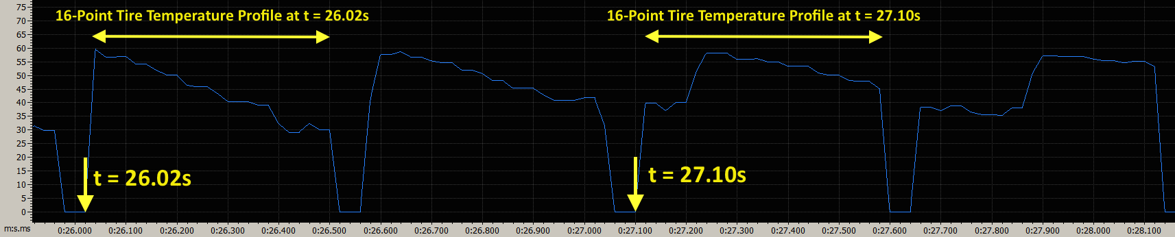 Instead of needing expensive analysis software, we’ve modified our sensor’s software so it effectively outputs the tire’s 16-point temperature profile at a given moment in time with just ONE temperature channel and can be analyzed with ANY analysis software. An example is shown below, which is displaying a tire’s 16-point lateral temperature profile at discrete points in time (twice a second) with a temperature vs. time plot. This feature will be especially useful with RaceCapture/Pro’s telemetry system, AiM's Race Studio, and Race Technology's Analysis software.