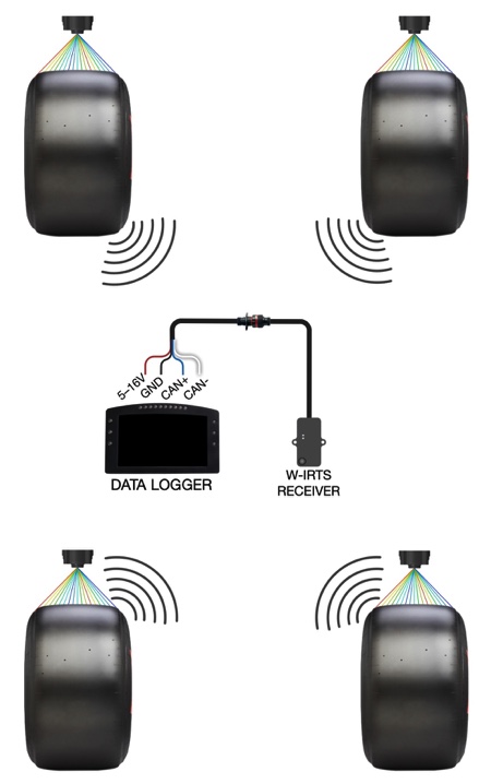 The Izze-Racing Wireless Infrared Temperature Sensor (W-IRTS) consists of a small, lightweight infrared temperature sensor capable of measuring temperature at 16 laterally-spaced points with a wide 120˚ FOV, at a sampling frequency of 10Hz, object temperature between -20 to 300˚C, and enclosed in a compact IP66 rated aluminum enclosure – perfectly suited for tire temperature measurement. Each wireless receiver can handle up to four active sensors simultaneously and broadcasts all data via CAN.